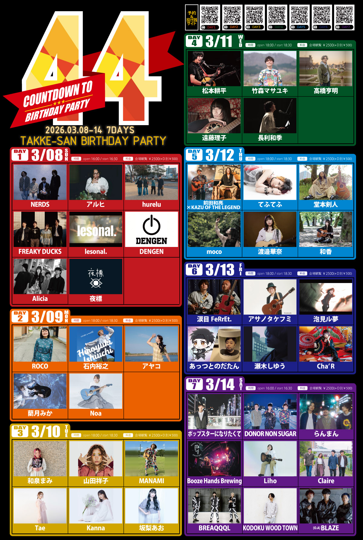 一般¥2500(+1drink別¥500) / 高校生以下¥1000(+1drink別¥500)